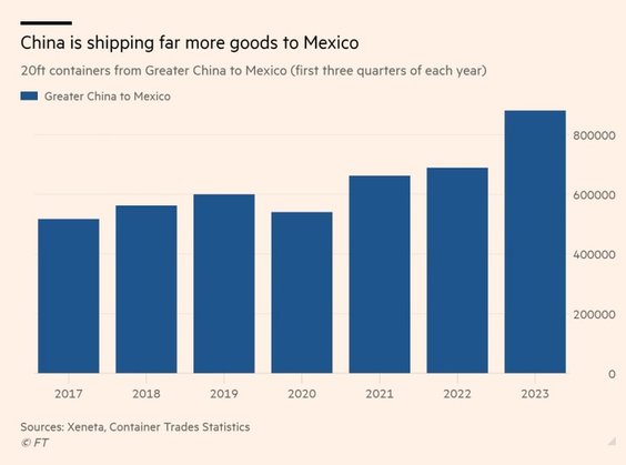 Szczególnymi beneficjentami wydają się chińscy producenci samochodów. Dane INA, meksykańskiej organizacji handlowej dostawców części samochodowych pokazują, że 33 chińskie firmy prowadzące działalność w Meksyku wysłały do USA części o wartości 1,1 miliarda dolarów w 2023 roku, w porównaniu z 711 milionami dolarów w 2021 roku. Meksyk zaimportował części samochodowe o wartości prawie 9 miliardów dolarów w zeszłym roku w Chinach, stwierdziła INA