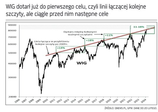 Jedną z metod, po jakie sięgnęliśmy w listopadowej analizie, było nakreślenie na wykresie WIG (w skali logarytmicznej) linii łączącej w przybliżeniu kolejne cykliczne szczyty, począwszy od 2011 r. O ile w czasie pisania tamtego artykułu WIG miał jeszcze sporo miejsca na zwyżkę w kierunku owej linii, to obecnie... właśnie do niej dotarł. Można zatem powiedzieć, że obecna hossa osiągnęła już swój pierwszy ważny punkt docelowy. Czy na tym już definitywnie koniec? Niekoniecznie. Po pierwsze, ten cel będzie się przesuwał powoli w górę. Po drugie, na tym samym wykresie, na którym nakreśliliśmy w listopadzie ową linię, pokazaliśmy, że WIG kolejne fale hossy kończył na poziomach znajdujących się 11–18 proc. powyżej odpowiedniego, poprzedniego szczytu. Doliczenie tych wartości do szczytu z końcówki 2021 r. daje przedział ok. 83–88 tys. pkt jako potencjalną strefę „szczytowania” indeksu w obecnym cyklu.