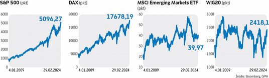 Spośród głównych giełd europejskich najmocniej zachowywały się indeksy we Frankfurcie. Do czwartku DAX zwyżkował o 1,5 proc., po raz kolejny poprawiając historyczny rekord. W lutym poszedł w górę o 4,6 proc. Niewielkiej, sięgającej 0,5 proc. spadkowej korekcie uległ paryski CAC 40, a londyński FTSE 250 szedł w dół o 0,65 proc. Po trzech kolejnych wzrostowych tygodniach korekcie uległ indeks rynków wschodzących, zniżkując o 1,5 proc. W lutym MSCI Emerging Markets zyskał jednak nieco ponad 4 proc. i momentami znajdował się na poziomie najwyższym od sierpnia ubiegłego roku. Słabnie dynamika odreagowania wcześniejszych spadków na parkiecie chińskim. Do czwartku Shanghai Composite zwyżkował o zaledwie 0,3 proc. W lutym poszedł w górę o nieco ponad 8 proc. Na parkietach naszego regionu zdecydowanie przeważały spadki. Wyjątkiem był zwyżkujący o ponad 6 proc. moskiewski RTS. Największe spadki, poza naszym indeksem blue chips, zanotowały wskaźniki w Ukrainie i Pradze o skali podobnej zresztą do WIG20.