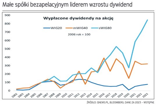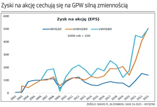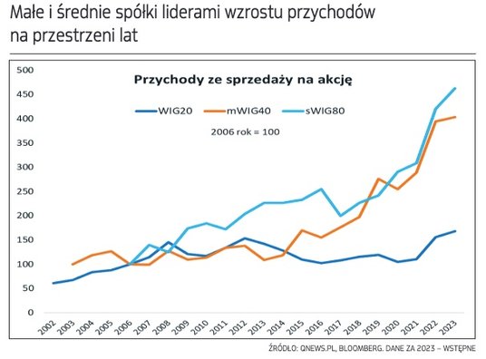 Ogółem w latach 2006–2023 wzrost przychodów wg wstępnych danych wyniósł ok. 3 proc. w skali roku w przypadku WIG20 oraz 8,6–9,4 proc. rocznie w przypadku odpowiednio mWIG40 i sWIG80.