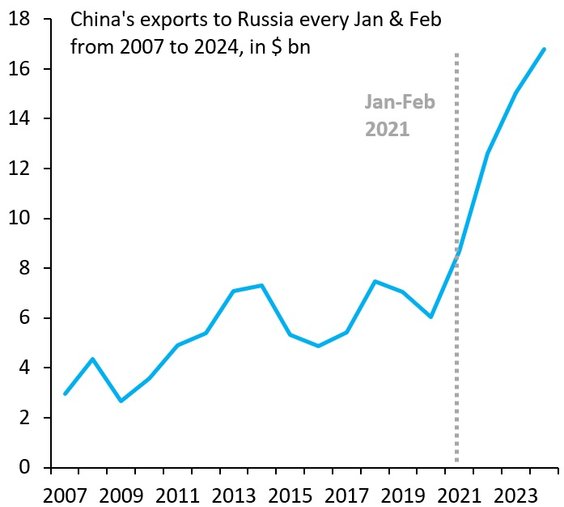 Rośnie też handel z Rosją. Dane dotyczące handlu chińskiego za 2023 rok pokazują, że eksport samochodów do Rosji był prawie siedmiokrotnie większy niż w 2022 roku, a wartość tego eksportu wzrosła o prawie 10 miliardów dolarów. Chińscy producenci samochodów byli szczególnymi beneficjentami exodusu korporacji Zachodu z Rosji, w wyniku którego wielu producentów samochodów szybko i tanio sprzedało aktywa i fabryki. Udział Chin w rynku rosyjskim wzrósł z niecałych 10 proc. do ponad 50 proc. w ciągu dwóch lat od rozpoczęcia wojny, którą Rosja nazywa „specjalną operacją wojskową”.