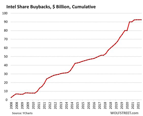Jednak od 2008 roku Intel spalił 94 miliardy dolarów w gotówce, aby odkupić własne akcje, aby podnieść cenę swoich akcji. Intel zaprzestał wykupu akcji własnych w 2021 r. pod rządami nowego dyrektora generalnego Pata Gelsingera, który nakłonił firmę do ponownego inwestowania swoich środków pieniężnych – a teraz pieniędzy podatników – w przyszłość firmy, aby nie pozostać całkowicie w tyle.
