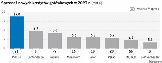 Z kolei jeśli chodzi o kredyty gotówkowe, sytuacja jest o tyle ciekawa, że mimo wysokich kosztów pieniądza w 2022 r. obyło się bez dramatycznego załamania, a w 2023 r. mieliśmy do czynienia z całkiem sporym wzrostem popytu. Nasza analiza wskazuje, że popyt na pożyczki gotówkowe rozłożył się zaś na poszczególne banki mniej więcej proporcjonalnie zgodnie ze schematem z lat poprzednich.
