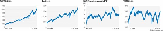 Poza główną walutą świata uwagę zwraca to, co dzieje się z jenem. Osłabieniu ulega on niemal nieprzerwanie od początku 2021 r., jednak w ostatnich dniach kwietnia osiągnął poziom najniższy od kwietnia 1990 r. Od początku roku traci względem dolara prawie 12 proc., najmocniej wśród światowych walut, jeśli nie liczyć egipskiego funta. To efekt wyjątkowo łagodnej polityki Bank of Japan, stojącej w kontrze do działań pozostałych głównych banków centralnych, czyli Fedu i EBC. Dzięki temu w Japonii w górę poszła inflacja, a gospodarka zaczęła lekko rosnąć. Tak rażąca słabość jena pobudza spekulacje mówiące o rychłej interwencji BoJ, by powstrzymać tę tendencję. Z kolei na słabości waluty korzysta japońska giełda. Nikkei od początku roku zyskuje nieco ponad 14 proc., plasując się w czołówce światowych indeksów, a pod koniec marca osiągnął poziom najwyższy w historii. Po czterotygodniowej korekcie, od dwóch tygodni przymierza się do kontynuacji tendencji wzrostowej. Korekta trwa natomiast na głównych parkietach naszego kontynentu. Niemiecki DAX do środy zniżkował o 1,4 proc. W kwietniu stracił 3 proc. Powrót do trendu wzrostowego może nastąpić po sygnałach EBC dotyczących rozpoczęcia cyklu łagodzenia polityki pieniężnej. O 1,3 proc. w ostatnich dniach kwietnia zniżkował paryski CAC 40, a miesiąc kończył spadkiem o 2,7 proc. Nieco lepiej radził sobie londyński FTSE 250, rosnąc do środy o 0,5 proc.