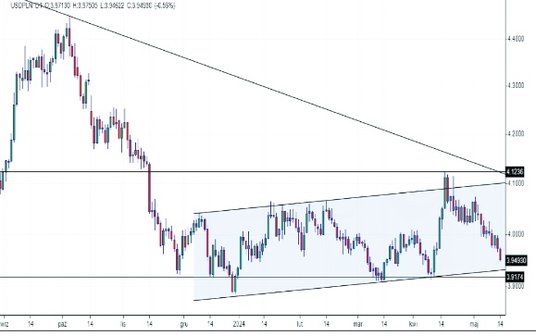Dołek tego układu ukształtował się w ostatnich dniach ubiegłego roku w okolicach 3,88 zł. Kolejne minima kanału wyrysowane zostały w pierwszych połowach marca oraz kwietnia. Od połowy stycznia do połowy lutego z kolei USD/PLN potwierdzał górne ograniczenia konsolidacji.