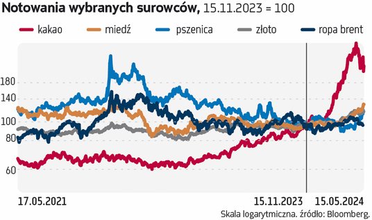 Choć przez to więcej błękitnego paliwa ze Wschodu może trafić do Europy, to jego notowania na Starym Kontynencie zachowują się spokojnie, w przeciwieństwie do cen na rynku amerykańskim, który opanowały byki (ramka 3). Mimo słabości gospodarek zjawisko short squeeze oraz nadzieje na stymulacyjną politykę w Chinach ciągną w górę ceny miedzi (ramka 4), na czym korzysta m.in. notowany na warszawskiej giełdzie KGHM.Tymczasem wśród kruszców zawodzi pallad, którego słabość widać zwłaszcza na tle platyny. Choć obu metali używa się w katalizatorach samochodowych, to ich zachowanie diametralnie się różni – jak się okazuje, nie bez przyczyny (ramka 5). Na rynkach zbóż kiełkuje hossa w notowaniach pszenicy (ramka 6). Być może jesteśmy za to świadkami końca spekulacyjnych zwyżek cen innego surowca rolnego – kakao. Po tym, jak w kilkanaście miesięcy zdrożało ono więcej niż pięciokrotnie, inwestorzy nagle rzucili się do drzwi wyjściowych. Prognozy deszczów w Afryce Zachodniej każą się spodziewać lepszych zbiorów, a w rezultacie w poniedziałek kurs tąpnął o 19,4 proc., najmocniej od 60 lat. Oto najważniejsze w maju tendencje na globalnych rynkach surowcowych.