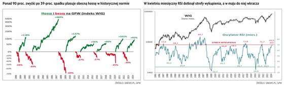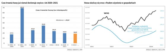 Również pod względem czasu trwania obecna hossa jest więc już dojrzała, aczkolwiek można sobie wyobrazić, że w sprzyjających okolicznościach może jeszcze potrwać. Mediana czasu trwania historycznych rynków byka to 24,9 miesiąca. Gdyby WIG miał wyrównać ten wynik, to powinien rosnąć mniej więcej jeszcze przez sześć miesięcy.