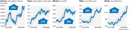 Dobrze zarobić inwestorom dały nie tylko giełdy akcji. Solidnych zwyżek doświadczyły też choćby metale szlachetne. Złoto zdrożało o 18 proc., a w poniedziałek jego cena przebiła poziom 2450 USD za uncję i ustanowiła nowy rekord. Przyczynił się do tego niepokój dotyczący sytuacji na Bliskim Wschodzie po śmierci prezydenta Iranu.