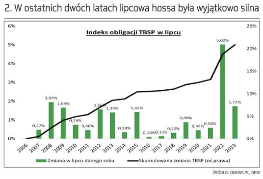 tyle zyskiwał średnio indeks obligacji TBSP w całej swej historii od 2007 r. W tym samym okresie średnia zwyżka WIG-u w lipcu wyniosła 2,7 proc. (przy czym indeks był na plusie w niespełna dwóch trzecich przypadków)