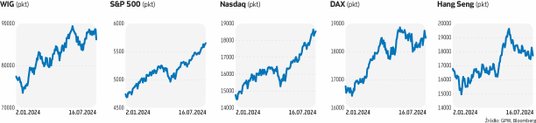 Wtóruje mu Jędrzej Janiak z F-Trust iWealth. – Druga połowa roku wydaje się bardziej wymagająca. Hossa na wielu rynkach jest zaawansowana, ale faktyczna realizacja się procesu spadku stóp procentowych może jeszcze nią nieco wydłużyć. Poza tradycyjnymi modelami cyklu koniunktury są oczywiście sektory bazujące na rozwoju sztucznej inteligencji, gdzie trudno oszacować skalę możliwego wpływu na biznesy, ale niewątpliwie zaskoczenia będą raczej w górę. Stąd naszym zdaniem błędem byłoby unikanie tego sektora, dlatego szacujemy, że akcje rynków rozwiniętych mimo wszystko sumarycznie mogą dalej zyskać, ze względu na duży udział big techów. Słabnący dolar, który reaguje na coraz bardziej prawdopodobne obniżki stóp, powinien wspierać też rynki wschodzące, które nie były ostatnio ulubionym tematem wśród inwestorów. Taki dość pozytywny scenariusz gospodarczy każe zachować ostrożność w stosunku do obligacji, które mogą zyskiwać, ale skala tego ruchu nie będzie za bardzo wynagradzała ponoszonego ryzyka.