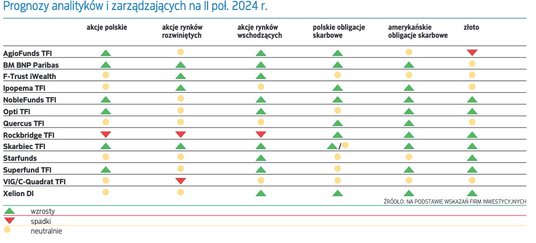 W ankiecie przeprowadzonej przez nas sześć miesięcy wcześniej zarządzający i analitycy z TFI i firm inwestycyjnych w perspektywie całego 2024 r. na ogół spodziewali się zwyżek polskich akcji. Jedynie dwóch ekspertów (na 15 zespołów) pozostawało wówczas neutralnych wobec krajowego rynku akcji. Taka jednomyślność pewnie u niejednego inwestora zaświeciła lampkę ostrzegawczą, a jednak okazała się bardzo trafna. Jak eksperci patrzą na rynki po ponad sześciu miesiącach tego roku, kiedy na ogół indeksy akcji rosły? Dziś, po blisko dwóch latach zwyżek cen polskich akcji, ich perspektywy – zdaniem przepytanych przez nas specjalistów – nie wyglądają już tak różowo, a niepewność czuć było choćby podczas wtorkowej sesji, gdy WIG tracił nawet 2,4 proc. Jak widać w tabeli obok, w odniesieniu do GPW przybyło pozycji neutralnych (w perspektywie II połowy roku), a niektórzy przewidują wręcz, że polskie indeksy na koniec roku będą niżej niż z końcem czerwca, co oczywiście wciąż oznaczać będzie niezłe zyski za cały 2024 r. Ankietowani nadal wskazują na atrakcyjne wyceny polskich akcji, ale niepewność budzą m.in. sporo wyższe mnożniki na rynku amerykańskim oraz nadchodzące wybory prezydenckie w USA, którymi jak dotąd inwestorzy niewiele się przejmują. Jak zauważa Dariusz Świniarski, zarządzający w Skarbiec TFI, wyceny spółek z GPW nadal uwzględniają dyskonto do MSCI Emerging Markets oraz do własnej dziesięcioletniej średniej. Skarbiec TFI wciąż też preferuje amerykańskie spółki, które dają ekspozycje na rozwój AI. – Parkiety europejskie wspierać będzie rozpoczęty proces luzowania monetarnego. Osłabiający się USD, perspektywa spadku kosztów finansowania w USD, to wsparcie dla parkietów akcji rynków rozwijających się – komentuje Świniarski.