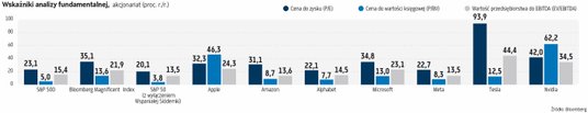 Hossa akcji największych firm technologicznych spowodowała, że ich wskaźniki analizy fundamentalnej są znacznie powyżej średniej dla S&P 500. Cena do zysku (P/E) dla Wspaniałej Siódemki wynosi 35, a dla pozostałych spółek z S&P 500 sięga 20,1. Podobnie jest w przypadku innych wskaźników, takich jak cena do wartości księgowej (P/BV) czy wartości przedsiębiorstwa do EBITDA (EV/EBITDA). Wskaźniki mogą sugerować, że akcje te są wyraźnie przewartościowane, jednak inwestorzy wierzą, że wyniki spółek w dalszym ciągu będą się poprawiać na fali sztucznej inteligencji. Dopóki tak faktycznie będzie, hossa akcji Wspaniałej Siódemki może trwać i wskaźniki będą dla inwestorów miały drugorzędne znaczenie. Wszystko może się zmienić, kiedy dynamika wyników negatywnie zaskoczy rynek.