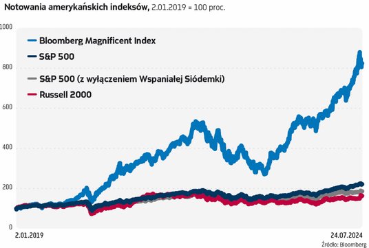 Giełdowymi liderami tego trendu są największe amerykańskie spółki technologiczne, które znane są konsumentom na całym świecie: Microsoft, Apple, Alphabet (dawniej Google), Meta (dawniej Facebook) i Amazon. Do tej listy możemy dodać firmę o dominującej pozycji w branży półprzewodników, która dostarcza niezbędne komponenty wykorzystywane przez sztuczną inteligencję: Nvidię. Grupa tych spółek, nazywana Wspaniałą Siódemką (do której zalicza się także Tesla), w ciągu ostatnich ośmiu lat odnotowała wzrost zysku o średnio 1200 proc., co daje średnioroczny wzrost o 36 proc. W tym czasie ich akcje zdrożały o 1450 proc., czyli średniorocznie o 40 proc. W efekcie Wspaniała Siódemka odpowiada dziś za około jednej trzeciej kapitalizacji indeksu S&P 500.