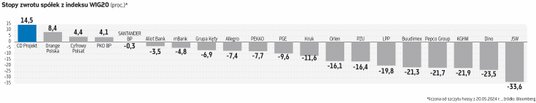 Jednocześnie zauważa, że WIG20 nie ma co liczyć na szerokie wsparcie innych kluczowych sektorów, co wyraźnie ogranicza jego potencjał wzrostu. – Inne składowe indeksu WIG20, aktualnie i w naszym odczuciu także w średnim horyzoncie, nie będą w stanie być silnym impulsem dla nowej fali wzrostowej. Ekspozycja surowcowa w postaci KGHM czy JSW stanowi blisko 6,5 proc. wagi w indeksie WIG20. Z kolei sektor paliwowy to blisko 12 proc. wagi indeksu. Ostatnie ochłodzenie nastrojów na rynkach zagranicznych, związane m.in. ze słabszą perspektywą makro gospodarki chińskiej, nie jest jednak dobrą kartą dla obozu byków – uważa Bobrowski.