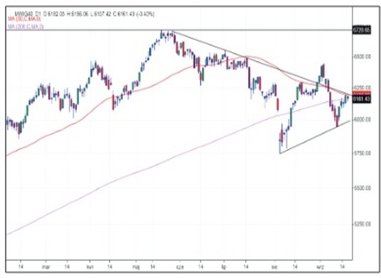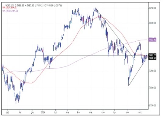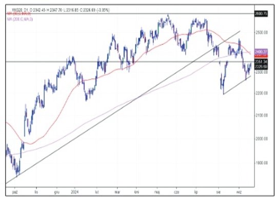 W środę inwestorzy wybrali raczej wariant wyczekiwania na decyzję Fedu co do obniżki stóp procentowych, która miała zostać podjęta wieczorem. Stąd większość indeksów akcji falowała w pobliżu poziomów zamknięcia z poprzedniego dnia. WIG20, będący jednym ze słabszych indeksów w Europie (choć towarzyszy mu m.in. paryski CAC 40), w godzinach porannych podjął próbę dotarcia do 2350 pkt, ale zabrakło mu milimetrów. Kolejne godziny upływały już na bacznym obserwowaniu wydarzeń na rynku amerykańskim. Wspomniany opór 2350 pkt wydaje się w krótkim terminie kluczowy dla indeksu dużych spółek.