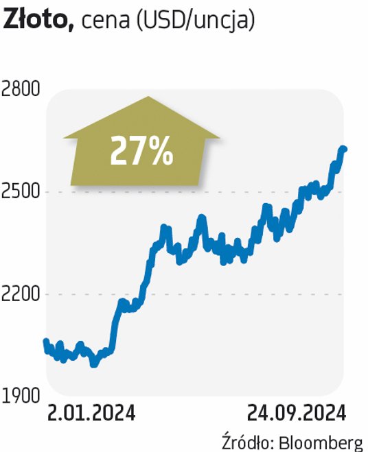 Cena złota ustanowiła we wtorek kolejny rekord, lekko przebijając poziom 2640 USD za uncję. Od początku roku wzrosła już o ponad 27 proc., a przez ostatnie 12 miesięcy o 37 proc. Kruszcowi pomogły na pewno napięcia geopolityczne na Bliskim Wschodzie, czyli wymiana ciosów pomiędzy Izraelem a Hezbollahem. Duży wpływ na wzrost jego cen w ostatnich dniach i tygodniach miały też oczekiwania dotyczące polityki pieniężnej w USA. Poniedziałkowe, dosyć słabe dane PMI z amerykańskiego przemysłu zwiększyły bowiem prawdopodobieństwo głębszych cięć stóp procentowych w nadchodzących miesiącach. Austan Goolsbee, szef oddziału Rezerwy Federalnej w Chicago, stwierdził, że spodziewa się „wielu cięć” na kolejnych posiedzeniach Komitetu Otwartego Rynku (FOMC).