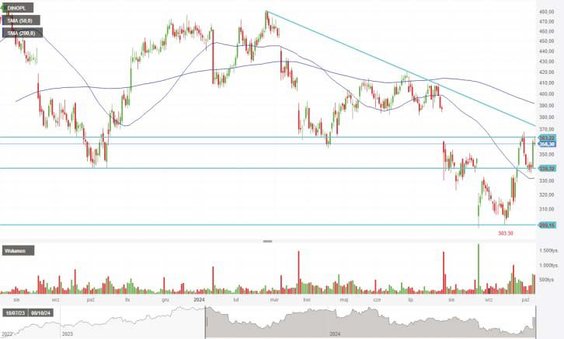 W obu wakacyjnych miesiącach kurs Dino Polska wyrysował dwie luki bessy – pierwsza nastąpiła po publikacji wyników Biedronki, druga zaś po raporcie samego Dino. W skutek sierpniowej przeceny kurs testował wsparcie na okrągłym poziomie 300 zł. Popyt w tym miejscu się przebudził i bardzo szybko podniósł kurs Dino o 30 zł wyżej z potwierdzeniem skoku obrotów. Ogólny marazm rynkowy we wrześniu dosięgnął jednak również i Dino, które jeszcze raz przetestowało 300 zł, i znów skutecznie dla popytu.