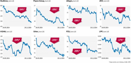 W ostatnich dniach przecena na giełdzie w Warszawie wyraźnie przyspieszyła, a dotyczyło to przede wszystkim właśnie akcji największych firm. WIG20 wyznaczył nowy dołek trwającej już pół roku korekty, a nawet otarł się o bessę. Co takiego się wydarzyło? Od wyborczego zwycięstwa Donalda Trumpa, które przyniosło krótkotrwałą euforię, mamy na rynkach do czynienia raczej z huśtawką nastrojów. Panuje niepewność m.in. co do możliwych napięć pomiędzy USA i Chinami. Jednocześnie wśród inwestorów wzrosły w ostatnio obawy o zaostrzenie konfliktu w Ukrainie – broniący się przed rosyjskim najeźdźcą kraj został wzmocniony decyzją Joe Bidena, który dał zgodę na wykorzystywanie amerykańskich rakiet dalekiego zasięgu w głębi Rosji, ta zaś odpowiedziała zmianą swojej doktryny atomowej.