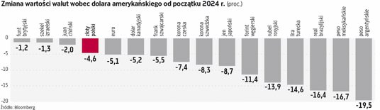 5 listopada, czyli w dniu wyborów prezydenckich w USA, kurs EUR/USD był w okolicach 1,09. W zeszły piątek spadał on nawet lekko poniżej poziomu 1,035 USD i był najsłabszy od jesieni 2022 r. Przyczyniły się do tego kiepskie dane PMI ze strefy euro. Od początku roku euro straciło już ponad 5 proc. wobec dolara, czyli zniżkowało bardziej niż na przykład polski złoty (który spadł o 4,6 proc.), ale mniej niż choćby korona szwedzka (która straciła 8,3 proc.).