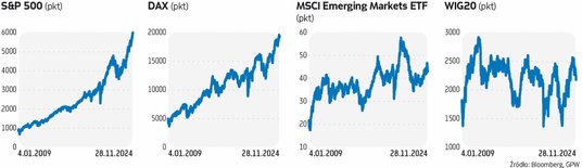 Wciąż blisko historycznego rekordu plasuje się DAX, który do czwartku zwyżkował o 0,6 proc. Z sięgającej od początku roku 16 proc. zwyżki inwestorzy też mogą się cieszyć, tym bardziej jeśli wziąć pod uwagę słabiutką kondycję niemieckiej gospodarki. Zdecydowanie gorzej radzi sobie paryski CAC 40, tracący w ostatnich dniach nieco ponad 1 proc. To już szósty spadkowy tydzień tego indeksu z rzędu, a od początku roku idzie on w dół o prawie 5 proc. Z kolei londyński FTSE 250 zwyżkuje od stycznia o 5 proc., w listopadzie rośnie o 1,8 proc., a do czwartku szedł w górę o 0,9 proc.