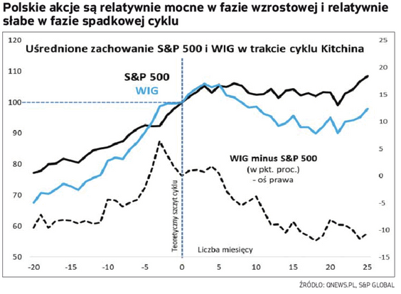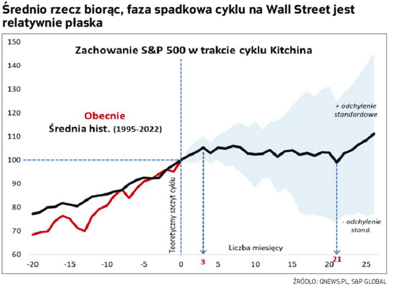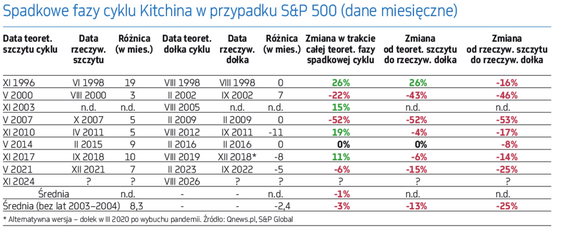 Z zamieszczonej przed tygodniem tabeli wynikało, że w niemal wszystkich historycznych przypadkach WIG był na minusie w okresie od teoretycznego terminu szczytu cyklu Kitchina do teoretycznego dołka. Średnio (z wyjątkiem nietypowych lat 2003–2004) WIG tracił w trakcie fazy spadkowej 20 proc. Na Wall Street te statystyki wyglądają dużo mniej negatywnie. Spora część historycznych przypadków była na dwucyfrowym… plusie, a średnia zmiana (bez lat 2003–2004) wyniosła -3 proc.