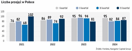 W ujęciu długoterminowym w Polsce widać utrzymującą się dużą aktywność transakcyjną. Spójrzmy na ostatnie lata. W 2016 r. fuzji było 188, w 2017 r. i 2018 r. po 211, w 2019 r. 191, w 2020 r. 244, w 2021 r. 328, w 2022 r. 341, a w 2023 r. 366. Innymi słowy, zeszły rok był drugim rekordowym po 2023 r. Liczba zrealizowanych w 2024 r. przejęć była o ponad jedną trzecią wyższa od średniej z lat 2016–2023 – wynika z naszych szacunków.