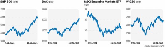 Wśród indeksów sektorowych pozytywnie wyróżniał się WIG-gry, który do czwartku zwyżkował o 6,3 proc., a od początku roku rośnie o 7,5 proc. Jest na poziomie najwyższym od czerwca 2023 r. Tylko w trakcie czwartkowej sesji indeks poszedł w górę o 5,5 proc. Gwiazdą są akcje CD Projektu, zwyżkujące w trakcie pierwszych czterech sesji minionego tygodnia o 7,8 proc., do poziomu najwyższego od prawie czterech lat. Do optymistycznych informacji dotyczących spółki doszła zapowiedź przeznaczania 25 proc. zysków netto na wypłatę dywidendy w tym roku i w kolejnych latach. Pozostałe firmy z branży gier komputerowych aż tak dobrze sobie nie radziły. Papiery 11 bit studios na przykład taniały o prawie 2,9 proc., będąc najniżej od jesieni 2017 r. Dobrą passę kontynuuje WIG-motoryzacja, zwyżkując o 2,8 proc. Wzrostowa fala trwa od listopada ubiegłego roku to już dziewiąty wzrostowy (z jednym wyjątkiem) tydzień z rzędu. Ton nadają tu walory Inter Carsu, zwyżkujące o 5,4 proc., a od początku roku już o 13 proc. Na przeciwnym biegunie znajdują się papiery drugiej pod względem kapitalizacji spółki z tego sektora, czyli Auto Partner, taniejące od początku roku niemal 12 proc., w tym w trakcie ostatnich czterech sesji o ponad 7 proc. Ubiegłoroczne straty odrabia WIG-paliwa, w styczniu zwyżkujący o 9 proc., a do czwartku o 2,5 proc. To już trzeci z rzędu wzrostowy tydzień. Tu oczywiście dominuje Orlen z tegoroczną zwyżką o ponad 9 proc. Poprawia się również sytuacja w sektorze górniczym, którego indeks zwyżkował do czwartku o 2,2 proc., a od początku roku rośnie o prawie 8 proc. Indeks w praktyce powiela notowania akcji KGHM-u, w mniejszym stopniu wspierany jest przez walory JSW, zwyżkujące do czwartku o 3,9 proc., które jednak napotykają nacisk podaży przy próbach mocniejszego ruchu w górę, co się dzieje już drugi tydzień z rzędu. Szósty tydzień z rzędu trwa spadkowa korekta indeksu branży odzieżowej. Jej indeks do czwartku tracił 1,4 proc. Rewelacyjnie sprawujące się w ubiegłym roku akcje CCC taniały do czwartku o prawie 2,3 proc., zaś papiery LPP zniżkowały o 1,2 proc., a momentami szły jeszcze mocniej w dół, schodząc poniżej 15 000 zł. Pod dominacją niedźwiedzi uginał się WIG-media, zniżkujący do czwartku o 4,2 proc. To drugi spadkowy tydzień z rzędu, ale patrząc z dłuższej perspektywy mamy tu do czynienia z trendem bocznym, trwającym od października ubiegłego roku. Indeksowi najmocniej ciążyły, taniejąc do czwartku o 5,8 proc., akcje Grupy Pracuj. Walory Wirtualnej Polski uległy przecenie aż o 7,5 proc., zaliczając trzeci z rządu tydzień spadku notowań, w wyniku czego po grudniowym skoku o 16 proc. nie ma już niemal śladu. Dobrą passę kontynuują z kolei papiery Agory drożejące siódmy tydzień z rzędu, tym razem o 4,8 proc., przy bardzo wysokim wolumenie obrotu. Jedenasty tydzień z rzędu utrzymuje się trend boczny w sektorze budowlanym. WIG-budownictwo zdominowany jest przez akcje Budimeksu i to ich zachowanie dyktuje tendencję, ale nie można tracić z pola widzenia pozostałych spółek. Kondycja tych największych również nie jest najlepsza. Akcje Mirbudu do czwartku taniały o 1,9 proc. (czwarty spadkowy tydzień z rzędu), a walory Śnieżki zniżkowały o 1,2 proc. (trend boczny). Pozytywnie wyróżniają się papiery Torpolu, drożejące o 3,9 proc. Nie ma wskaźnika obrazującego koniunkturę w sektorze handlu, ale warto zwrócić uwagę na sytuację tego typu spółek. Akcje Dino podskoczyły do czwartku o prawie 7 proc. (od początku roku zwyżkują o niemal 12 proc.). Spadkową tendencję wyhamowały papiery Allegro. O prawie 9,3 proc. w górę szły walory Eurocashu, próbując wyjść górą z wielkotygodniowej tendencji bocznej. Trwa z kolei fatalna passa papierów Pepco, które do czwartku taniały o 8,4 proc., testując dołki z listopada ubiegłego roku, stanowiące historyczne minimum notowań.