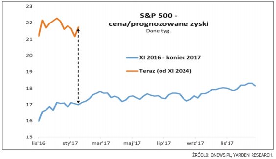 Tym razem wyceny startują 30 proc. wyżej | O tym, że rok 2025 może nie być prostą kalką roku 2017, ostrzega poziom wycen amerykańskich akcji. Kiedy Trump wygrywał wybory na jesieni 2016 r., wyprzedzający wskaźnik P/E w przypadku S&P 500 wynosił ok. 16 i z tego umiarkowanego na tle historycznym pułapu (niewiele odstającego od wieloletniej średniej) kontynuował potem wspinaczkę powyżej 18 na koniec 2017 r. Tymczasem obecnie w chwili drugiej wygranej Trumpa na jesieni 2024 r. wskaźnik P/E przekraczał 21 i od tego czasu przeżywa huśtawkę na tym relatywnie wygórowanym pułapie. Obecne wyceny amerykańskich akcji są zatem prawie 30 proc. wyższe niż na początku pierwszej kadencji republikanina. W ceny walorów wkalkulowana jest więc większa porcja optymizmu.