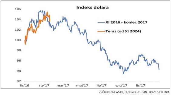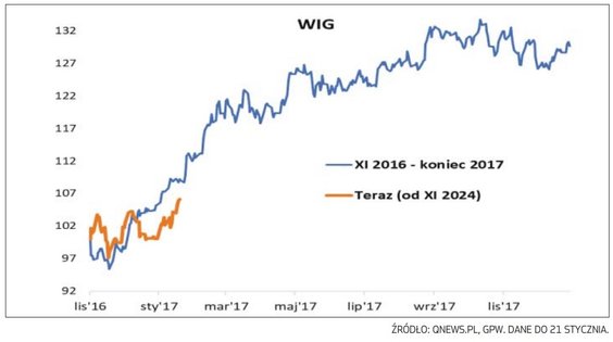 Poprzednio Trump nie zaszkodził GPW | Pierwszy rok Trump 1.0 jeszcze bardziej niż na Wall Street był udany dla akcji na rynkach wschodzących oraz na GPW. Co prawda pierwsze tygodnie po tamtej wygranej republikanina przyniosły jeszcze nerwowość, ale potem, w 2017 r., WIG urósł o ok. 23 proc. (a indeks rynków wschodzących aż o 34 proc.). Co ciekawe, obecna ścieżka naszego rodzimego benchmarku nie odbiega znacząco, jak na razie, od tamtego pierwowzoru (termin lokalnego dołka z połowy listopada niemal perfekcyjnie pokrył się z tym z 2016 r.). W chwili pisania artykułu WIG wspina się na poziomy ostatnio widziane prawie pięć miesięcy temu. Polskie akcje, w odróżnieniu od amerykańskich, są teraz tańsze niż na początku pierwszej kadencji Trumpa.