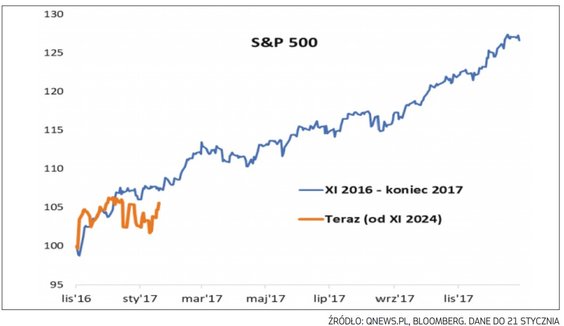 Pierwszy rok Trump 1.0 przyniósł wspinaczkę S&P 500 | W trakcie pierwszego roku swojej poprzedniej kadencji Donald Trump regularnie chwalił się w mediach społecznościowych nowymi rekordami S&P 500. Trzeba przyznać, że indeks systematycznie wspinał się na coraz wyższe pułapy, a jednym ze sprzyjających czynników były przygotowania do radykalnego ścięcia podatku dochodowego dla firm, choć nie był to jedyny ważny element (o czym jeszcze za chwilę). Jak na tym tle wygląda obecne zachowanie S&P 500? W pierwszych tygodniach po wyborczej wygranej Trumpa tempo zwyżki indeksu było zadziwiająco podobne do tego z końcówki 2016 r. – rynek zareagował równie entuzjastycznie. Od grudnia obserwujemy jednak podwyższoną zmienność w porównaniu z tamtym pierwowzorem.