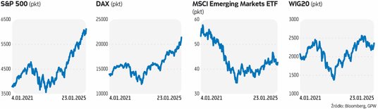 Wbrew przesłankom fundamentalnym oraz zagrożeniem, jakie mogą na europejską gospodarkę sprowadzić amerykańskie cła, na giełdach naszego kontynentu optymizmu nie brakuje. Do czwartku DAX zwyżkował o 2,5 proc. Mamy więc piąty z rzędu zwyżkowy tydzień tego indeksu i kolejny historyczny rekord. O 2,4 proc. w górę szedł paryski CAC 40. Po dwóch tygodniach mocnych wahań ustabilizował się londyński FTSE 250, zniżkując o symboliczne 0,5 proc. (po skoku o niemal 4,5 proc. z poprzedniego tygodnia). Z mniejszym niż poprzednio impetem zwyżkę kontynuuje indeks rynków wschodzących. MSCI Emerging Markets do czwartku rósł o 1,4 proc. Na jego zwyżkę pracowały głównie giełdy europejskie i Ameryki Południowej, a na parkietach azjatyckich sytuacja była zróżnicowana. W Szanghaju i Hongkongu spadki sięgały po około 0,5 proc., a na Tajwanie indeks rósł o ponad 1,5 proc.