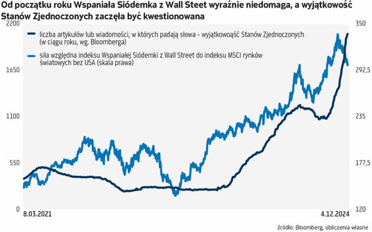 Zarówno w 2000, jak i w 2007 roku najpierw światowe giełdy, a następnie gospodarki musiały zmierzyć się ze skutkami pęknięcia baniek spekulacyjnych – w pierwszym przypadku na spółkach internetowych, a w drugim na nieruchomościach i finansujących je bankach. Choć dziś oczywistym bohaterem spekulacji jest sztuczna inteligencja, to moim zdaniem nie można mówić o tym, że wydarzenia z początku tego roku to koniec trendu. Niektórzy inwestorzy, ze słynnym Nassimem Talebem na czele, uznali ostatnio, że zaskakująco skuteczne dołączenie małej chińskiej spółki DeepSeek do wyścigu o globalny prymat w branży AI było równoznaczne z przewróceniem pierwszej kostki domina, a rynkowy reset zarówno wycen, jak i oczekiwań inwestorów jest nieunikniony. W nieco mniej pesymistycznym tonie wypowiedział się niedawno Michael Hartnett z Bank of America, który jako pierwszy użył określenia „Magnificent 7”. Jego zdaniem pojawienie się chińskiego gracza na rynku AI skutecznie zakwestionowało dominację Stanów Zjednoczonych w dziedzinie sztucznej inteligencji. Konsekwencją tego nie będzie jednak spektakularne pęknięcie bańki spekulacyjnej, ale zakończenie okresu wyjątkowości USA („Peak US Exceptionalism”) i tym samym detronizacja Wall Street (wykres 2). Natomiast wspaniała siódemka („Magnificent 7”), czyli wciąż najbardziej „zatłoczony” zakład inwestycyjny, może zostać z tyłu („Lagnificent 7”), pozwalając się wyprzedzić innym rynkom, sektorom i spółkom (np. bankom). W gruncie rzeczy z takim właśnie scenariuszem mamy do czynienia od kilku tygodni.