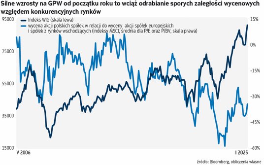 Analizując publikowane przez strategów i analityków prognozy na 2025 rok, widać, że w większości zakładali oni, iż będzie to kolejny okres dominacji amerykańskiej giełdy. Trend wzrostowy, oprócz wspaniałej siódemki (Apple, Microsoft, Alphabet, Amazon, Meta, Nvidia, Tesla), miał w większym stopniu objąć także mniejsze i średnie firmy oraz sektory wpierane polityką nowo wybranego prezydenta Donalda Trumpa. Pierwsze tygodnie pokazały jednak, że rynki finansowe nie lubią poruszać się pod dyktando większości. Tegorocznym hitem jak na razie są akcje spółek ze Starego Kontynentu oraz z branż innych niż technologiczna. Przy zaledwie 2–3-proc. wzrostach indeksów na Wall Street zyski sięgające 8–12 proc. w Europie Zachodniej robią wrażenie. Indeks S&P 500 zdołał ustanowić w tym roku nowy rekord tylko raz, zaraz po inauguracji prezydentury Donalda Trumpa. Niemiecki DAX dokonał tego wyczynu już 16 razy w ciągu pierwszych 31 sesji 2025 roku. Prawdziwą gwiazdą i praktycznie liderem światowych rankingów giełdowych został jednak indeks krajowych dużych spółek WIG20. Wskaźnik szerokiego rynku WIG po sześciu wzrostowych tygodniach z rzędu i zwyżce o 16 proc. z przytupem pokonał rekord osiągnięty w połowie maja ubiegłego roku (wykres 1).