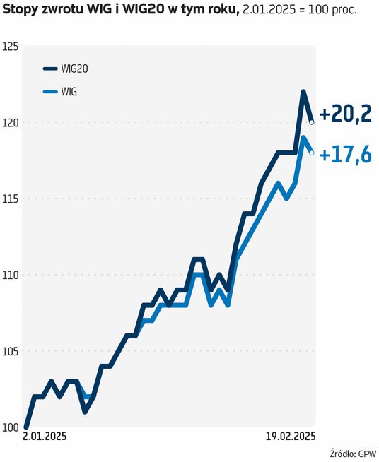 Na koniec wtorkowej sesji WIG20 znalazł się najwyżej od niemal 14 lat. Szczyt z 2018 r. został przekroczony o 26 pkt. Początek środowej sesji przyniósł kontynuację zwyżek, ale trwała ona ledwie kilkanaście minut, w czasie których indeks dużych spółek dotarł niemal do 2695 pkt. Dawało to niemal 23-proc. zwyżkę WIG20 od początku roku, ale zarazem w tym miejscu nastąpił odwrót kupujących. Od godzin porannych zaczął się też wyraźnie osłabiać złoty zarówno do dolara, jak i do euro. Dotychczas umocnienie polskich akcji szło w parze z siłą waluty, zwłaszcza wobec euro.