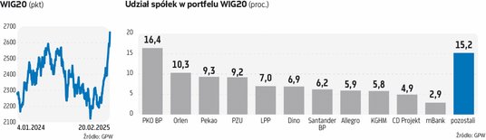 „Parkiet” regularnie sprawdza, jaka jest fundamentalna wartość WIG20, czyli bazująca na średnich cenach docelowych akcji spółek z aktualnych rekomendacji. Z analizy przeprowadzonej na początku 2025 r. wynikało, że liczba niedowartościowanych blue chips była najwyższa, odkąd zbieramy dane, a teoretyczna wartość indeksu przekraczała poziom 2,6 tys. pkt. Obserwowana od połowy stycznia poprawa nastrojów rynkowych na GPW sprawiła, że kilka dni temu ten optymistyczny scenariusz się zrealizował. Mimo środowej i czwartkowej korekty indeks nadal ma wartość ponad 2,6 tys. pkt, a od początku 2025 r. urósł już o jedną piątą.