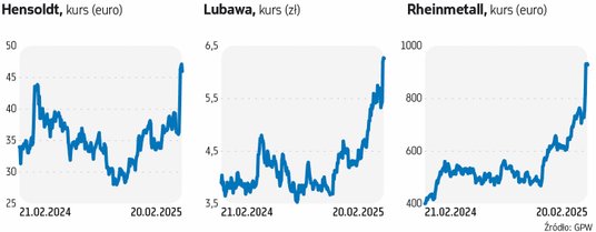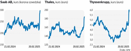 Na celowniku inwestorów znalazły się przede wszystkim akcje europejskich dostawców uzbrojenia, jak największy niemiecki koncern Rheinmetall (producent m.in. czołgów Leopard i Abrams), brytyjski BAE Systems (znany z produkcji m.in. bojowych wozów piechoty Bradley, czołgów Challenger 2 czy najnowszych atomowych łodzi podwodnych Royal Navy), szwedzki Saab (m.in. dostawca samolotów bojowych i okrętów podwodnych) oraz kilku innych dostawców. Rynek najwyraźniej dostrzegł w nich beneficjentów nowej powojennej rzeczywistości w Europie, która oznacza konieczność dalszego zwiększania wydatków krajów UE na obronność, aby móc wziąć pełną odpowiedzialność za bezpieczeństwo regionu i nie być zależnym od USA. – W ostatnich tygodniach europejskie spółki zbrojeniowe odnotowały znaczące wzrosty kursów, co było w głównej mierze reakcją na wypowiedzi prezydenta USA Donalda Trumpa oraz kluczowych członków jego administracji. Po pierwsze, po raz kolejny (m.in. na szczycie w Davos) zapowiedział on konieczność zwiększenia wydatków na obronność w państwach NATO do 5 proc. PKB wobec 2 proc. obecnie. Po drugie, administracja Trumpa przedstawiła w lutym plan negocjacji z Rosją i Ukrainą, mający na celu zakończenie konfliktu pomiędzy tymi państwami. Plan ten zakłada większe zaangażowanie państw Europy w zakresie zapewnienia pokoju i bezpieczeństwa na Starym Kontynencie, a USA mają skupić się na swoich interesach m.in. w Azji – wyjaśnia Lukas Cinikas, analityk BM Pekao.