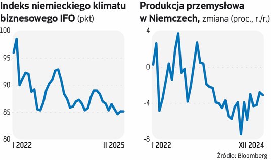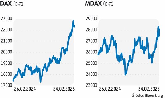 DAX, czyli główny indeks niemieckiej giełdy, zyskiwał na początku poniedziałkowej sesji 0,7 proc., a po południu utrzymał umiarkowane tempo wzrostu. Zyskiwały m.in. papiery niemieckich koncernów motoryzacyjnych i zbrojeniowych. Akcje Rheinmetall, producenta czołgów Leopard 2, rosły o 3 proc. MDAX, indeks niemieckich średnich spółek, zyskiwał po południu 2,6 proc. i wyglądało na to, że doświadczy największej jednodniowej zwyżki od 14 miesięcy. Wiele europejskich indeksów giełdowych również zyskiwało podczas poniedziałkowej sesji, a euro stało się najmocniejsze od blisko miesiąca wobec dolara. W ten sposób rynki europejskie reagowały na wynik niedzielnych wyborów parlamentarnych w Niemczech.