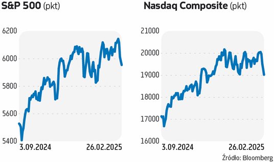 Liczony przez CNN indeks strachu i chciwości (Fear & Greed Index) wynosił w środę 22 pkt, czyli był na poziomie sugerującym, że na amerykańskim rynku akcji panuje „ekstremalny strach”. Ledwie tydzień wcześniej wynosił on 46 pkt i był na poziomie „neutralnym”. Jednym z impulsów, który pogorszył nastroje na rynkach, był wtorkowy odczyt indeksu nastrojów konsumenckich Conference Board. Zniżkował on ze 105,3 pkt w styczniu do 98,3 pkt w lutym. Był to jego największy miesięczny spadek od czasu pandemii. Interpretowano go jako sygnał wzrostu obaw konsumentów przed inflacją. Konsumenci oraz inwestorzy mogą czuć się rozczarowani tym, że prezydent Trump skupia się obecnie na podwyżkach ceł, a nie na cięciu podatków oraz zmniejszaniu regulacji.