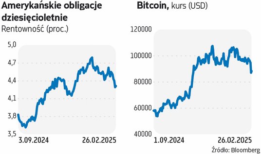 Czy inwestorzy z Wall Street zaczynają przygotowywać się na ewentualne spowolnienie gospodarcze w USA? Takie można odnieść wrażenie, przyglądając się zarówno sytuacji na rynku akcji, jak i notowaniom obligacji. Rentowność amerykańskich papierów dziesięcioletnich spadła na początku tego tygodnia poniżej poziomu 4,3 proc. i była najniższa od połowy grudnia. (W środę lekko wzrosła i wynosiła po południu 4,3 proc.). Tymczasem główne indeksy z Wall Street spadły od dnia zaprzysiężenia Donalda Trumpa na drugą kadencję prezydencką. Rynkowy optymizm, towarzyszący początkowi jego rządów, jakby się ulotnił.