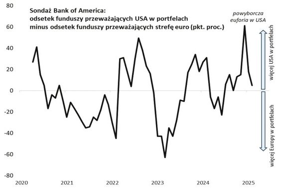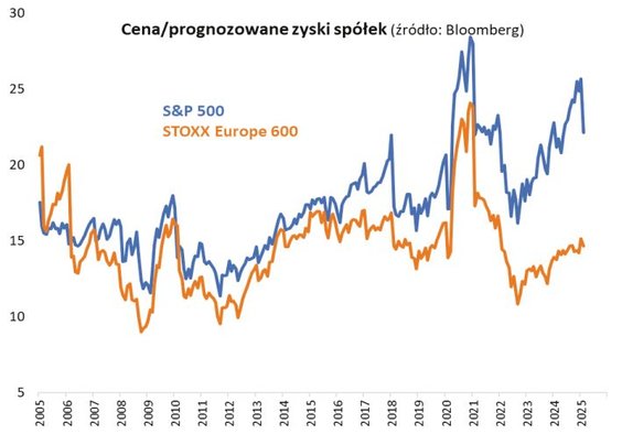 Podczas gdy prognozy ekonomistów z dużym opóźnieniem reagują na zmieniające się otoczenie, dostosowanie na rynkach akcji trwa już od końcówki ubiegłego roku. Listopad, a więc miesiąc wyborów prezydenckich w USA, wyznaczył szczyt przewagi amerykańskich akcji. Od tego czasu trwa normalizacja wysokich wycen na Wall Street, wynikająca z przysłowiowego powrotu na ziemię po okresie powyborczej euforii, a jednocześnie podnoszenie się mnożników na Starym Kontynencie. Tradycyjnie akcje w USA wyceniane są wyżej, ale w ub.r. ta różnica osiągnęła szczególnie wyśrubowane poziomy – współczynnik ceny do prognozowanych zysków spółek był o 11 pkt wyższy niż w Eurolandzie (bazując na danych Bloomberga). Mimo że do końca lutego różnica ta skurczyła się do 7,5 pkt, i tak pozostaje relatywnie duża w porównaniu z historycznymi standardami – średnia za cały okres przedstawiony na wykresie to niecałe 3 pkt. Europa ma ciągle co nadrabiać względem nadal relatywnie drogich akcji na Wall Street.