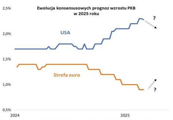 Jeśli popatrzeć na przedstawione na wykresie „konsensusowe” prognozy ekonomistów, to trudno dopatrzyć się na razie jakiegokolwiek zawężania silnych rozbieżności między Europą i USA. Tymczasem pojawiają się sygnały mogące zapowiadać z jednej strony rewizje w dół szacunków wzrostu PKB w USA, a z drugiej, szanse na rewizje w górę w strefie euro (perspektywa odblokowania środków na wydatki zbrojeniowe). Szerokim echem odbiło się załamanie odczytów znanego modelu GDPNow oddziału Fedu w Atlancie, który w ostatnich tygodniach zaczął sygnalizować… spadek amerykańskiego PKB w I kwartale. Po przetłumaczeniu na ujęcie „rok do roku” szacuje on wzrost na skromne 1,4 proc. Zakładając nawet, że model przereagował ostatnie osłabienie różnych danych makro, to i tak jednak wydaje się, że prognozy ekonomistów na ten rok mogą okazać się zbyt wygórowane. Być może proces rewizji właśnie się rozpoczyna, o czym świadczy pierwsze od sierpnia ub.r. drgnięcie średnich prognoz dla USA w dół.