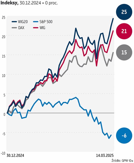 Zmianie nastawienia do polskich akcji sprzyjają trwające negocjacje, zmierzające do zakończenia wojny w Ukrainie, które zaczęły nabierać coraz bardziej realnych kształtów wraz z przejęciem przez Donalda Trumpa władzy w USA. To przekłada się na spadek ryzyka geopolitycznego w naszym regionie, czego głównymi beneficjentami są największe spółki, wywodzące się przede wszystkim z indeksu WIG20. Od początku 2025 roku poszybował w górę o ponad 25 proc. Z kolei WIG zyskał ok. 21 proc. Jak wyjaśnia Krzysztof Kamiński, analityk Oanda TMS Brokers, inwestorzy zagraniczni coraz chętniej kierują swój kapitał na polski rynek, co wynika z rosnącego prawdopodobieństwa deeskalacji wojny w Ukrainie. – Perspektywa pokoju prowadzi do napływu środków do Europy Środkowo-Wschodniej, a Warszawa jest jednym z największych beneficjentów tego trendu. Obecna hossa to efekt „gry pod pokój”, w której kapitał zagraniczny koncentruje się na rynkach, które mogłyby najbardziej skorzystać na zakończeniu konfliktu. Dobre nastroje na GPW wspierają także solidne fundamenty polskich spółek. W efekcie szeroki indeks WIG może wkrótce osiągnąć poziom 100 tys. pkt – uważa ekspert.