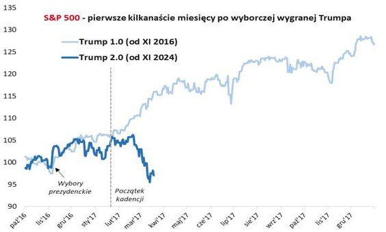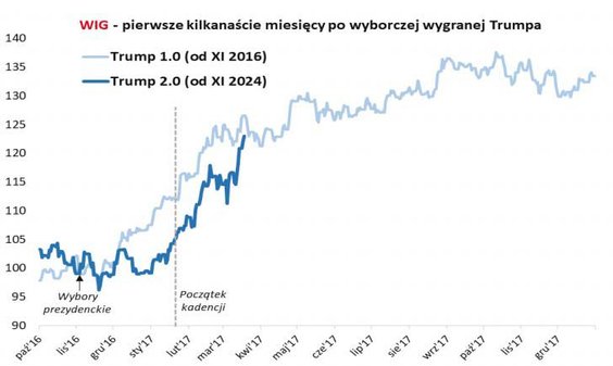 Reakcja amerykańskich akcji po dwóch miesiącach jest wyraźnie negatywna, wobec jednoznacznie pozytywnej w początkach pierwszej kadencji. Ale nie wszystkie opisywane wcześniej podobieństwa legły w gruzach – zachowanie notowań dolara i polskich akcji to niemal kopia wydarzeń z „Trump 1.0”, przynajmniej na razie.