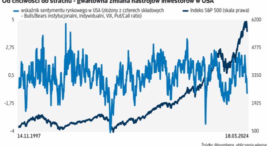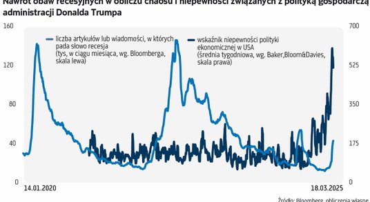 Choć obecna przecena jest płytsza i krótsza niż ta sprzed ponad sześciu lat, to strach zasiany już w umysłach inwestorów jest porównywalny. Wskaźniki sentymentu rynkowego znalazły się w połowie marca na poziomach widzianych ostatnio w okolicach rynkowego dołka z 2022 r., pandemicznego krachu z 2020 r. oraz właśnie z końcówki 2018 r. (wykres 1). Tak wtedy, jak i teraz za rynkowym tąpnięciem stały m.in. obawy o możliwość recesji wywołanej działaniami Donalda Trumpa. W tamtym czasie istotny wpływ odegrała też restrykcyjna polityka monetarna Fedu i wzrost rentowności dziesięcioletnich obligacji skarbowych USA powyżej poziomu 3 proc. (dzisiejszym odpowiednikiem były obawy z początku 2025 r. o rychłe przebicie poziomu 5 proc. przez te obligacje). Wtedy skończyło się na strachu, a indeks Nasdaq 100 odrobił wszystkie straty równie szybko, jak je poniósł (w trzy miesiące).