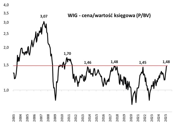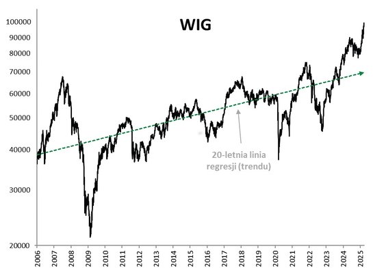 Kiedy na jesieni 2022 roku WIG runął w okolicę 45 tys. pkt na skutek strachu na rynkach związanego z atakiem inflacji, podwyżkami stóp procentowych na świecie i geopolitycznymi konsekwencjami rosyjskiej inwazji na Ukrainę, chyba nikt nie spodziewał się, że raptem 2,5 roku później indeks znajdzie się nieopodal 100 tys. pkt. Choć perspektywa pokonania tego pułapu to teraz oczywisty powód do świętowania, można się zastanawiać, czy giełdowe wahadło, które na jesieni 2022 r. drastycznie przechyliło się w stronę negatywną, teraz nie przechyla się przypadkiem za bardzo w drugą stronę? Na wykresie pokazujemy, że WIG już mocno oderwał się w górę od 20-letniej linii regresji (trendu), wyznaczającej typowe tempo wspinaczki indeksu. Dzieje benchmarku w ostatnich dwóch dekadach to wahania wokół tej linii. Zjawisko to może niepokoić, choć pamiętajmy też, że w czasie silnego trendu wzrostowego nie jest łatwo złapać szczyt koniunktury.
