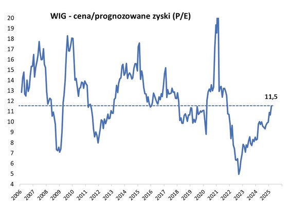 Pokaźny, jak na historyczne standardy, zasięg obecnej hossy na GPW to częściowo efekt tego, z jak niskiego pułapu startowały (na jesieni 2022) wyceny akcji. Przypomnijmy, że bloombergowski wskaźnik ceny do prognozowanych zysków spółek runął wtedy w okolicę zaledwie 5 (niżej niż w trakcie globalnego kryzysu finansowego 2008/2009). Stamtąd przebył już długą drogę w górę, ale czy doszedł do niebezpiecznie wysokiego pułapu? W okolicy 11,5 w momencie pisania tego artykułu wskaźnik jest na umiarkowanym poziomie. Na GPW nie jest już tanio (najlepsza okazja za nami), ale drogo też jeszcze nie. Pomijając już zniekształcone przez pandemię ekstremalne wartości z 2021 roku, typowe, cykliczne szczyty P/E formowały się w przedziale mniej więcej 15–18. Do tych wartości brakuje jeszcze ok. 30–50 procent! Czynnik ryzyka to chwiejny historycznie poziom zysków polskich spółek, które w razie niekorzystnego scenariusza w gospodarkach potrafiły szybko ulegać redukcji.