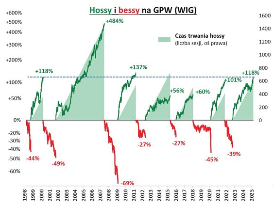 Czas odświeżyć nasz wykres z cyklicznymi hossami i bessami na GPW. Kiedy w pierwszej połowie ubiegłego roku zasięg zwyżki WIG od dołka z jesieni 2022 zbliżył się do 100 proc., pokazywaliśmy, że pod tym względem hossa dorównuje już niemal poprzedniemu rynkowi byka, zakończonemu w 2021 roku. Teraz, gdy w momencie pisania tego artykułu, skala zwyżki doszła już do 118 proc., okazuje się, że trend wzrostowy osiągnął rozmiary dokładnie takie, jak na szczycie w marcu 2000 roku (koniec „bańki internetowej”). Oznacza to, że lista przypadków na naszym wykresie, w których zasięg zwyżki jest co najwyżej taki jak obecnie, wydłużyła się do czterech (spośród sześciu). Hossa niewątpliwie jest więc jeszcze bardziej zaawansowana, jak na historyczne standardy (również pod względem czasu trwania). Zaawansowana, co nie znaczy jednak ekstremalnie „rozciągnięta”, bo przecież nadal daleko jej do osiągnięcia rozmiarów porównywalnych z epokowym rynkiem byka z lat 2002–2007.