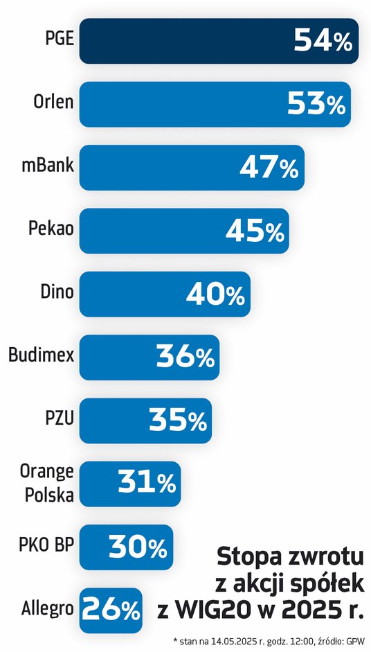 W jego ocenie w dalszej części roku utrzymanie dotychczasowego tempa zwyżek indeksów wydaje się mało realne. Nie wyklucza też korekty. – W maju mieliśmy obniżkę stóp procentowych o 0,5 pkt proc., a w perspektywie kwartału pewnie kolejną, co może oddziaływać negatywnie na sektor bankowy. Pokusa realizacji zysków jest duża i aby utrzymać obecną dynamikę wzrostów, oprócz dobrego otoczenia zewnętrznego w indeksie WIG20 muszą znaleźć się inne spółki, które będą napędzać wzrosty. Z kolei duży udział zagranicy na naszym rynku i powrót siły dolara mogą przyciągnąć kłopoty dla polskiego rynku. Dodatkowo kwestia rozejmu w Ukrainie nadal się przeciąga, więc inwestorzy mogą powoli być zmęczeni brakiem rozstrzygnięcia. Statystycznie wchodzimy w gorszy okres dla rynku akcji (maj–październik), co na pewno nie będzie pomagać – zauważa ekspert.