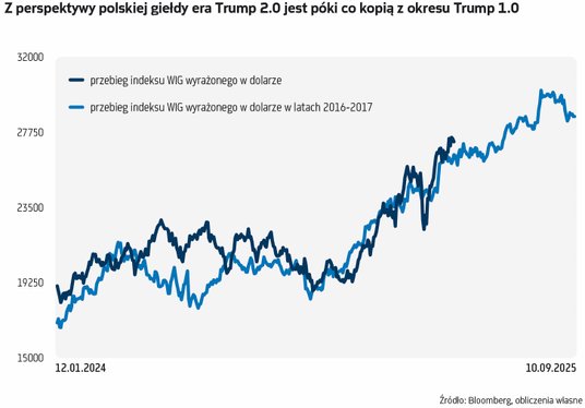 Polska giełda zaskakiwała siłą już przed tzw. dniem wyzwolenia, a indeks WIG20 do 2 kwietnia był liderem światowych rankingów tegorocznych stóp zwrotu. Miesiąc później polskie indeksy akcji wciąż są na topie (tylko giełda w Ghanie okazuje się lepsza w tym roku), a liczona w dolarze stopa zwrotu z indeksu WIG przekroczyła już 40 proc. Ostatni raz podobny pokaz siły naszego rynku (tak jak i szeroko pojętego regionu – giełdy węgierska, czeska, austriacka czy grecka również świetnie sobie radzą) miał miejsce w pierwszym roku pierwszej kadencji prezydenta Donalda Trumpa. Z naszej perspektywy okres Trump 2.0 jest niemal kalką ery Trump 1.0, pomijając zmienność wywołaną rozpoczęciem wojen handlowych na pełną skalę, której w 2017 roku jeszcze nie było (podnoszenie ceł zaczęło się w 2018 roku) (wykres 1).