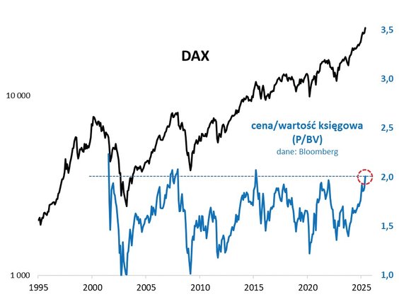 O ile na GPW nie jest jeszcze szczególnie drogo, o tyle poziom wycen robi się niepokojąco wysoki u naszego zachodniego sąsiada. Niemiecki DAX kończył maj powyżej dwukrotności wartości księgowej – po raz pierwszy od dekady. Stąd już dosłownie tylko kilka procent dzieli go od ważnych szczytów koniunktury z lat 2015 i... 2007. Z tamtych szczytów wskaźnik P/BV spadał potem, prędzej czy później, co najmniej w okolice 1,50 (a więc o ok. 30 proc.). Wyraźnie drożej na giełdzie we Frankfurcie było tylko w okresie tzw. bańki internetowej na przełomie wieków. Czy i tym razem można liczyć na taki „bańkowy” scenariusz, skoro po nowym niemieckim rządzie oczekuje się stymulacji fiskalnej gospodarki o rozmiarach niewidzianych od lat? Z drugiej strony zagrożeń też przecież nie brakuje – począwszy od agresywnych żądań handlowych prezydenta Trumpa, a skończywszy na chińskiej konkurencji dla niemieckich producentów.